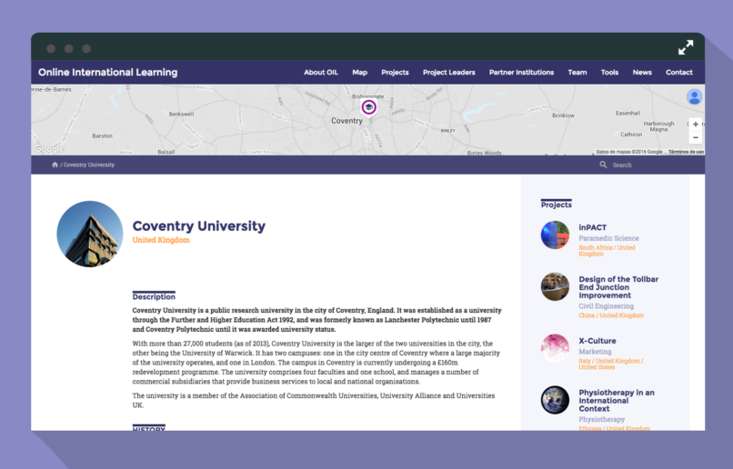 Online International Learning (OIL) es el término con el que la Universidad de Coventry (Inglaterra) nos presentó este proyecto. Podría traducirse en «Aprendizaje Online Internacional» y proporciona a los estudiantes una oportunidad de interactuar con compañeros de otras universidades, desarrollando competencias interculturales al igual que trabajando juntos en tareas de asignaturas especificas o actividades.
